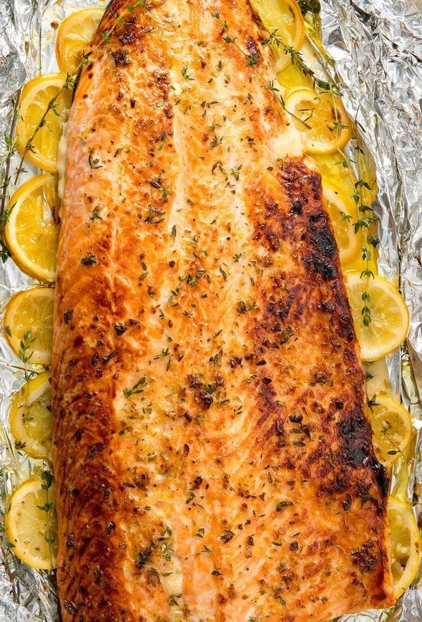 In a small bowl, whisk together butter, honey, garlic, thyme, and oregano. Pour over salmon then fold up foil around the salmon. Bake until the salmon is cooked through, about 25 minutes. Switch the oven to broil, and broil for 2 minutes, or until the butter mixture has thickened.