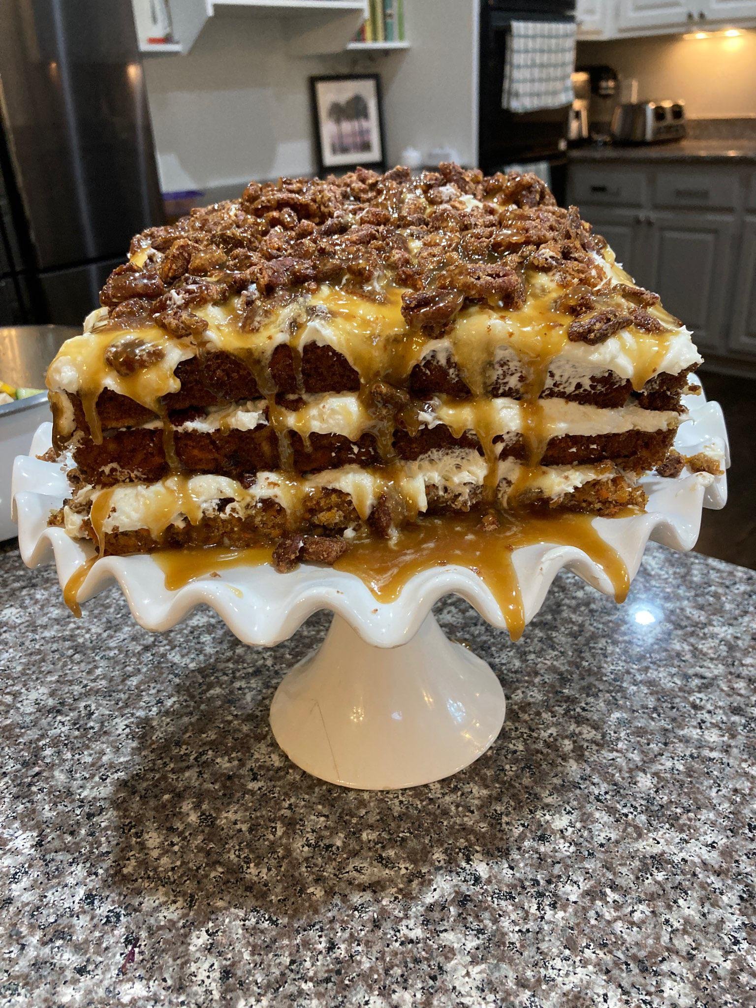 Carrot Spice Cake with Cream Cheese Frosting, Candied Pecans, and Salted Caramel Sauce