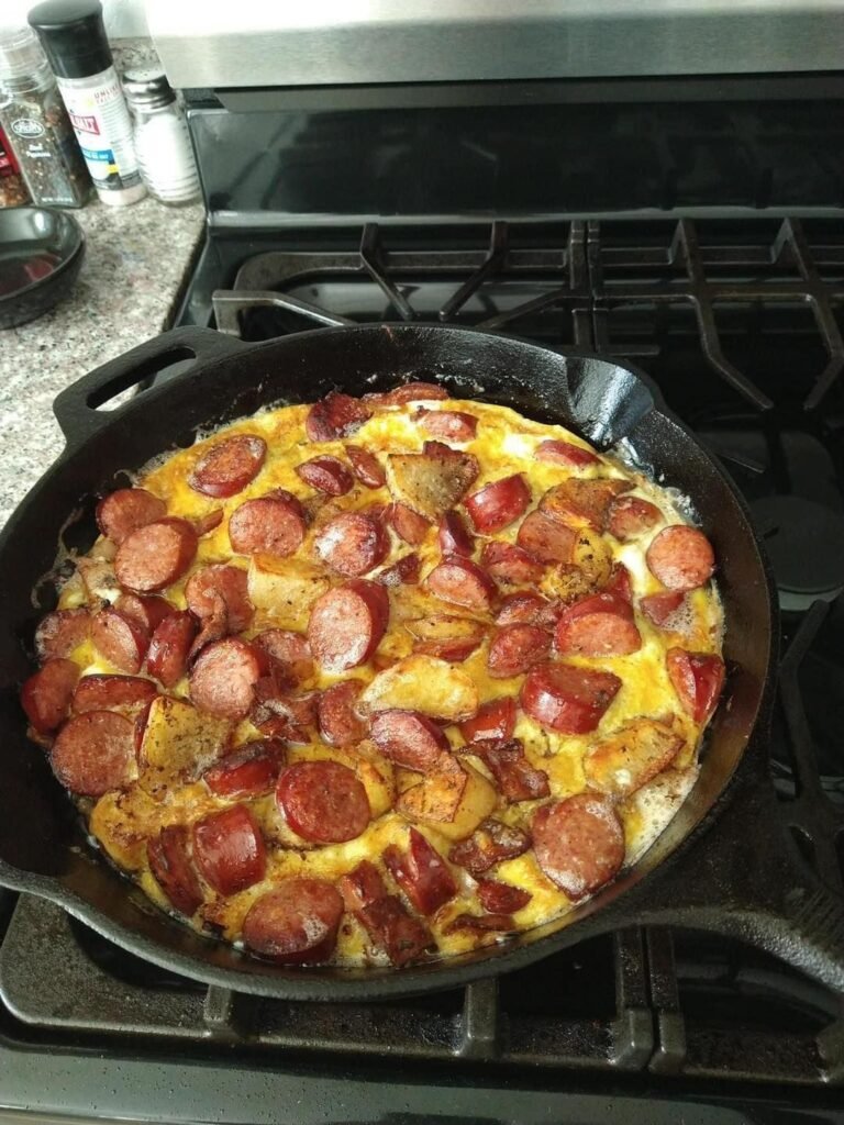 THE INGREDIENTS LIST: A large Pkg.Of frozen shredded hash brown potatoes. A medium Pkg.Of fully-cooked Polish sausage. 1½ Cups.Of grated sharp cheddar cheese. 1 Cup.Of sour cream; at room temp. …