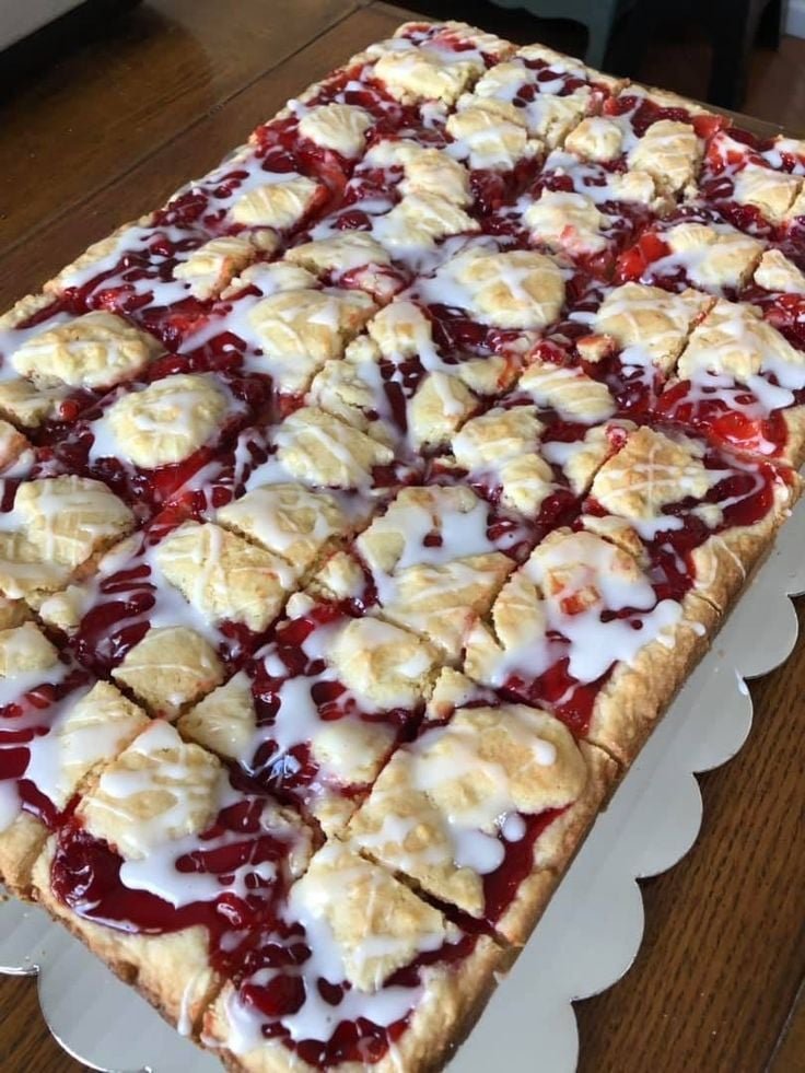 Remove from the oven and place pan on a wire rack to cool completely. Once cooled prepare the glaze. Whisk together confectioners’ sugar and milk until smooth and drizzle over the bars. Cut into 35 squares and serve.