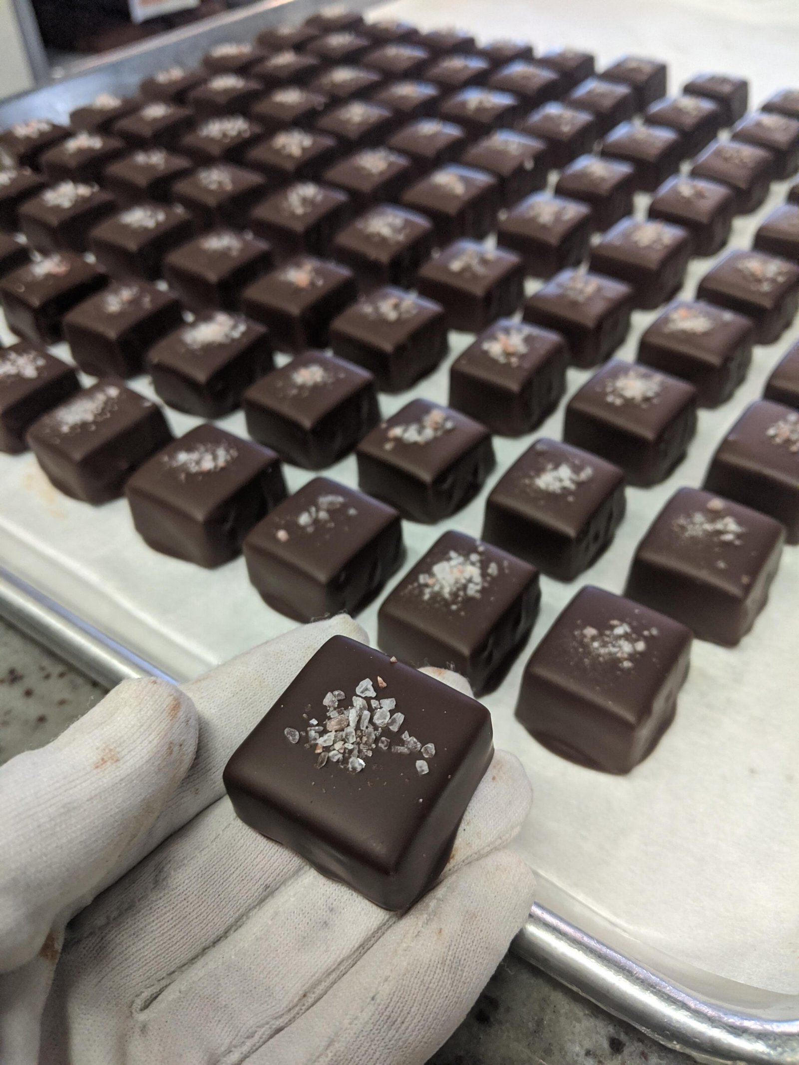 - While the chocolate is still wet, sprinkle a pinch of sea salt flakes on top of each caramel.