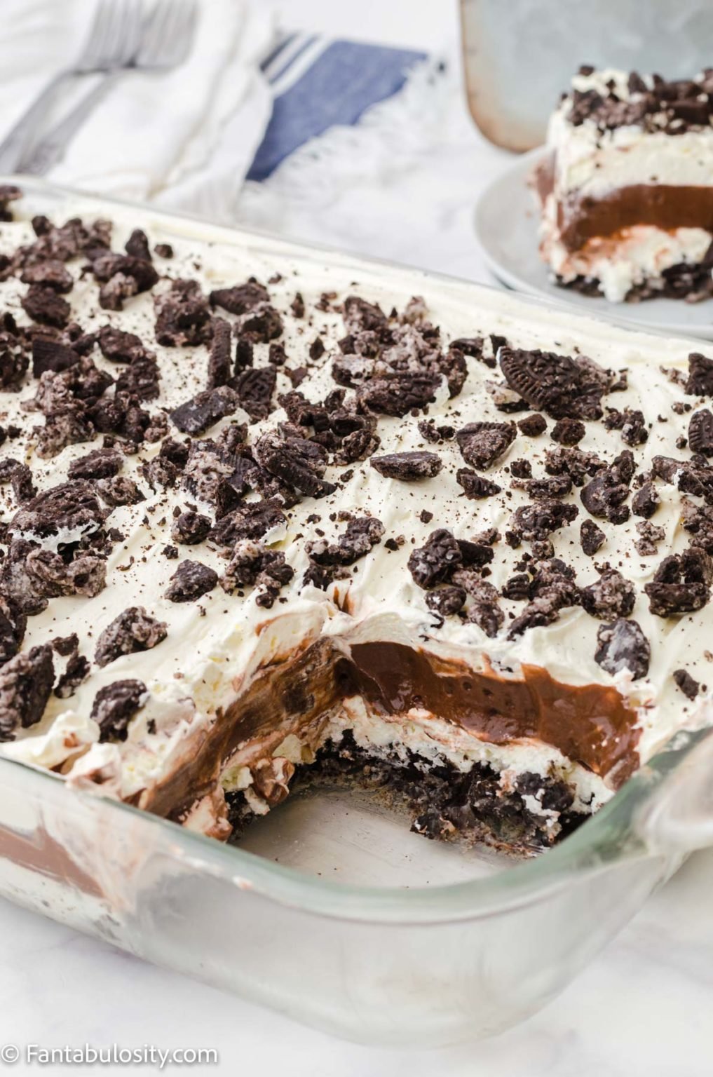Heavenly No-Bake Chocolate Lasagna is a decadent and indulgent dessert that is perfect for a special occasion or a potluck. This dessert is made with layers of Oreo cookie crust, creamy cream cheese mixture, chocolate pudding, and Cool Whip, and is topped with mini chocolate chips. This dessert can be customized by using different flavors of instant pudding mix or by adding different toppings such as chopped nuts or caramel sauce. Enjoy this delicious and easy-to-make Heavenly No-Bake Chocolate Lasagna!