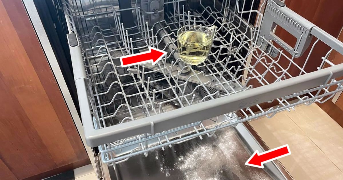 After sprinkling baking soda on the dishwasher, fill a glass of white vinegar to the brim and place it in the center of the dishwasher’s top rack.