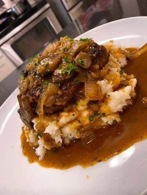 Enjoy your delicious and satisfying Salisbury Steak with Garlic Mashed Potatoes and Mushroom & Onion Gravy!