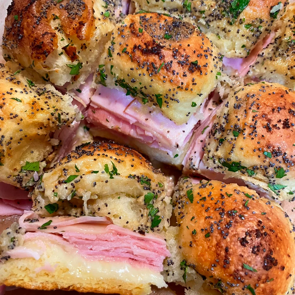 - Place the top halves of the rolls on top of the ham and cheese to create sandwiches.