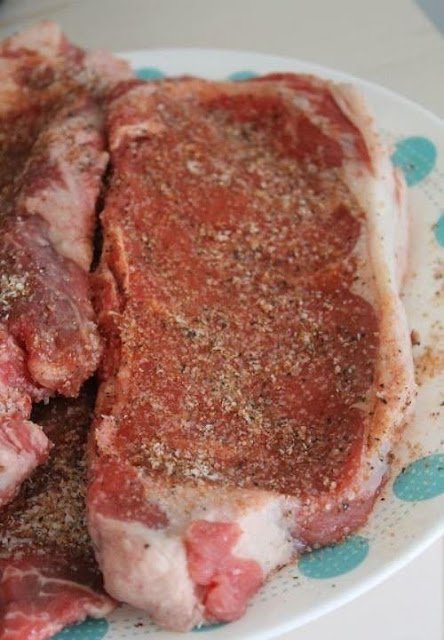 Then generously spoon the seasoning mixture over each steak (on each side).