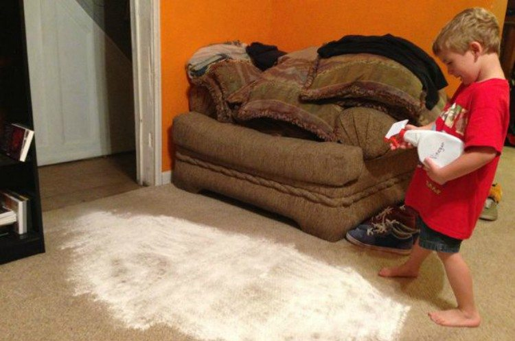 After your carpet starts to look like a winter wonderland, grab your vinegar and water bottle, shake it slightly, and spray the mixture directly onto the baking soda. You’ll soon have ‘volcanic’ bubbles, so if you have kids, make sure you’re around. Hours of fun for the whole family!
